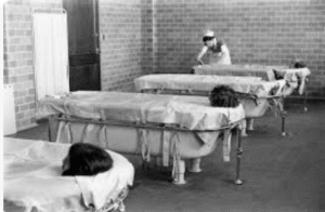 Patients were strapped in ice cold baths for hours, sometimes days, their skin would shrivel as they shivered. Others were confined in straightjackets or left in dark, padded cells where silence and isolation was thought to calm the mind. Electrotherapy was introduced – jolts of electrical current meant to shock insanity out of the brain. Early machines had no safeguards and patients were often burned. The voltage even caused some patients to burst into flames. The surviving patients were left with second and third degree burns, broken bones and destroyed brains.