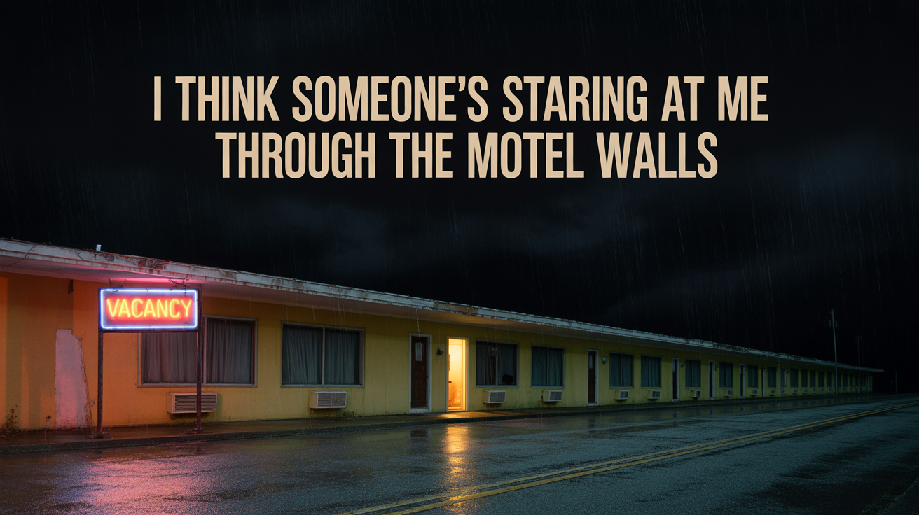 It’s the kind of weather that turns the sky into a bruise — purple, swollen clouds churning low over the highway. The rain starts so hard and sudden that my wipers can’t keep up. My headlights catch the warped shape of a roadside sign: “Vacancy”, the letters flashing unevenly in a faded neon pink.
